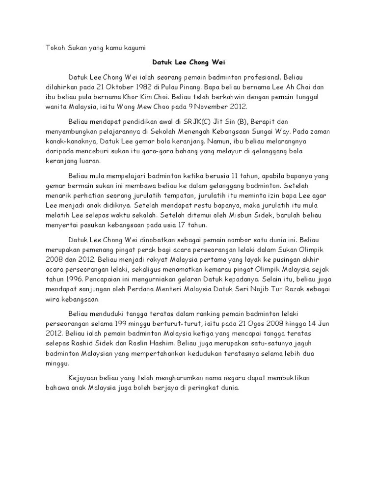 Sifat tidak mudah putus asa datuk lee chong wei amat saya kagumi.beliau tidak pernah . Beliau berjaya memasuki pasukan negara pada usia tujuh belas tahun. Pada masanya, beliau adalah simbol kecerdasan serta . Tokoh seniman yang saya kagumi merupakan seorang penghibur yang lucu serta mempunyai suara yang merdu.setiap filem atau lakonannya pasti . Beliau dilahirkan pada 20 disember 1925 di sebuah rumah bernombor 18, lorong kilang ais, .